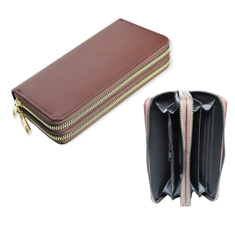 Esta billetera para mujer está hecha de cuerina sintética encerado con broches y cremalleras de metal. El cuero suave y la excelente artesanía garantizan la resistencia a la abrasión de la billetera.