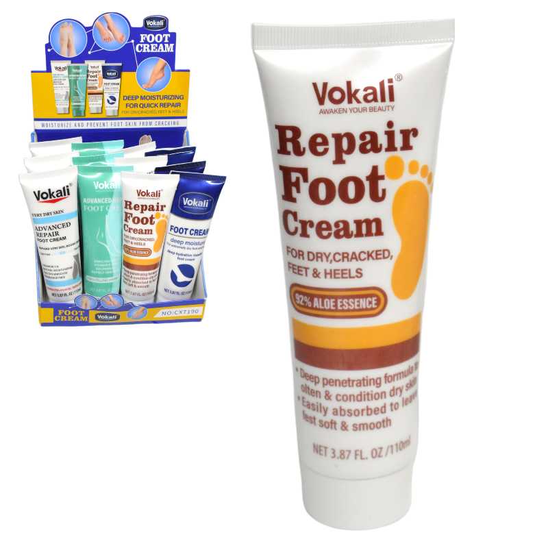 Crema para pies vokali con extractos de aloe vera tubo letras cafés